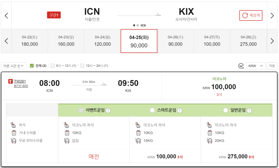 항공권예매 검색 화면에서
